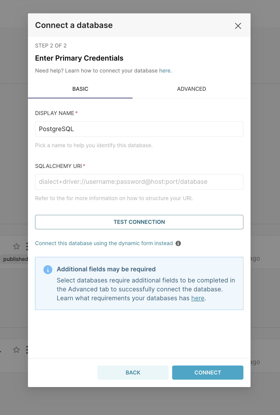 Once you've clicked that link you only need to specify two things (the database name and SQLAlchemy URI):